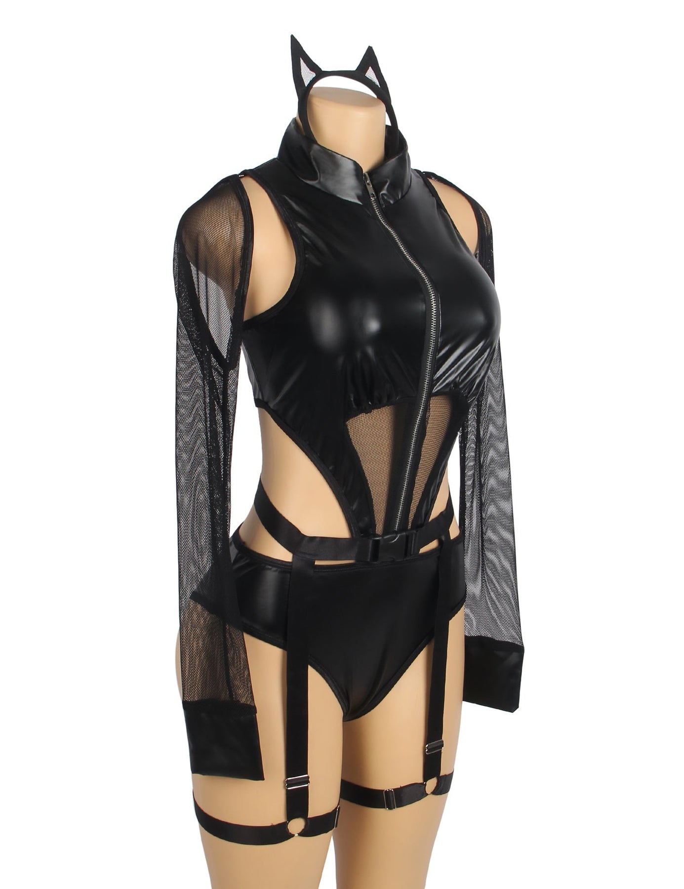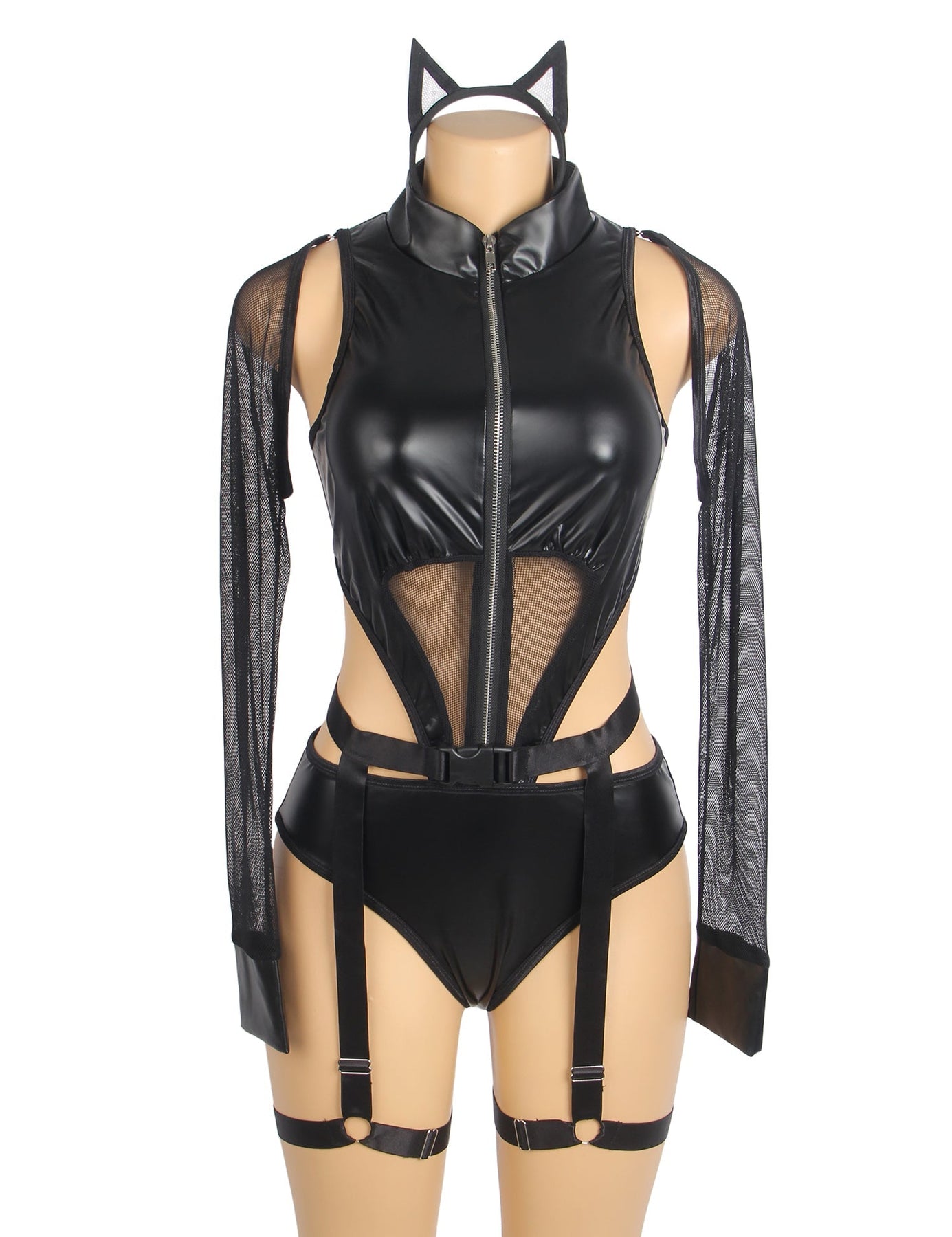 Includes: Bodysuit + detachable garters + cat-ear headband